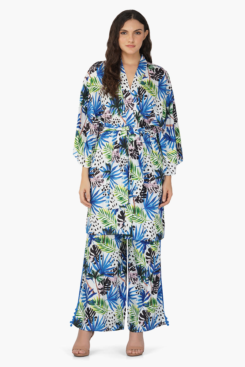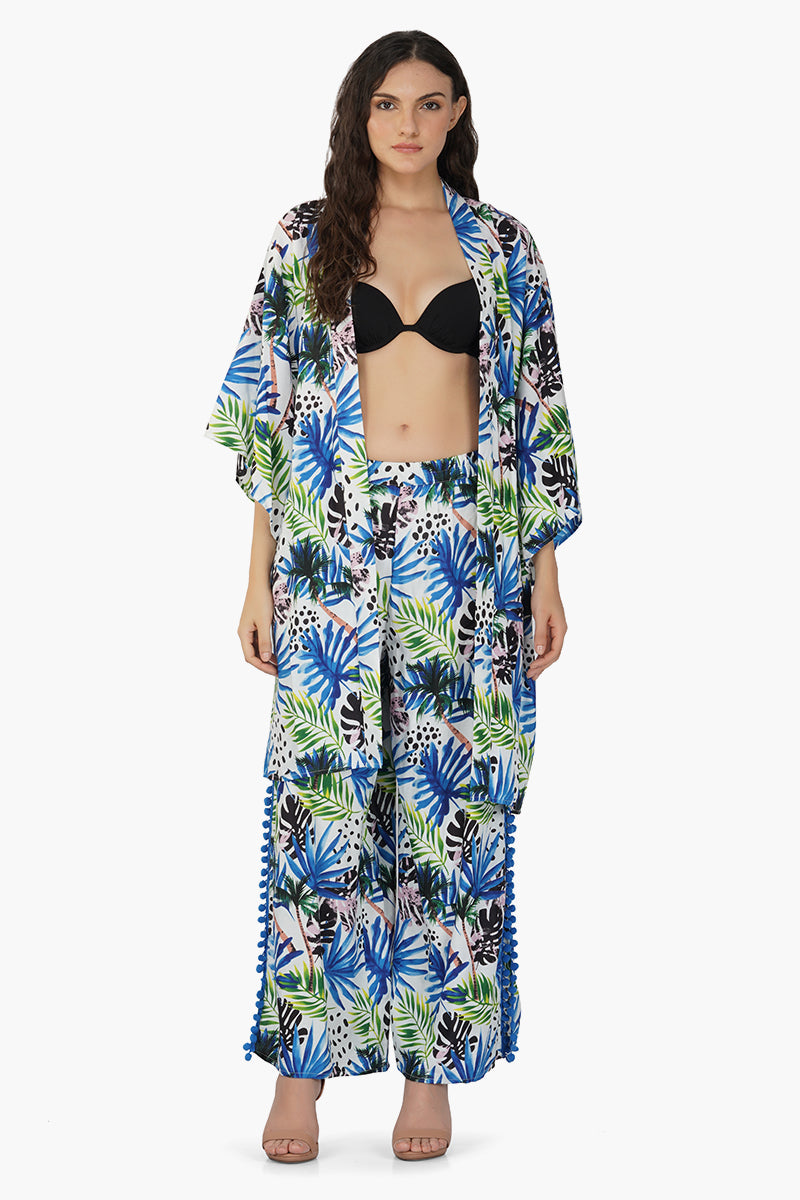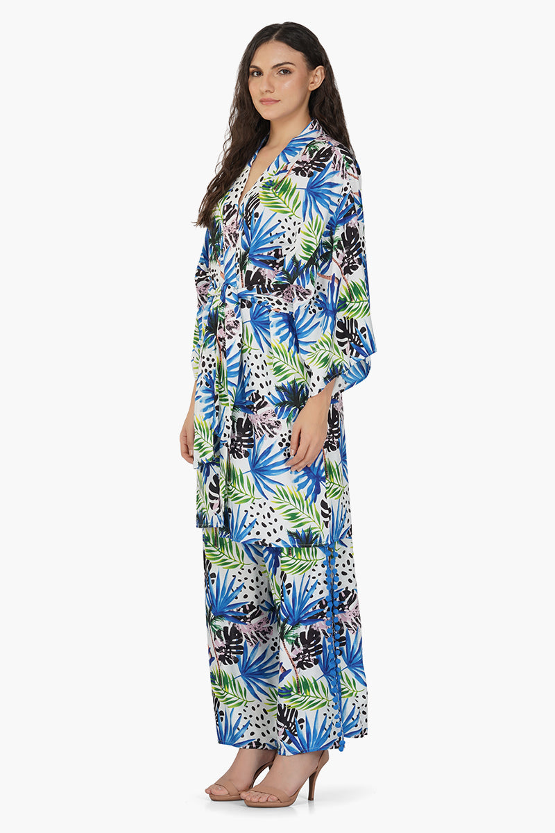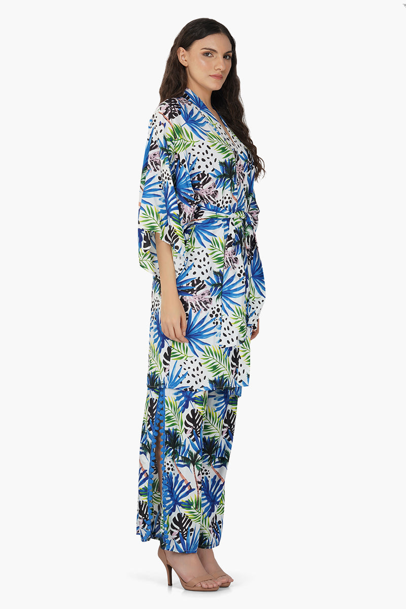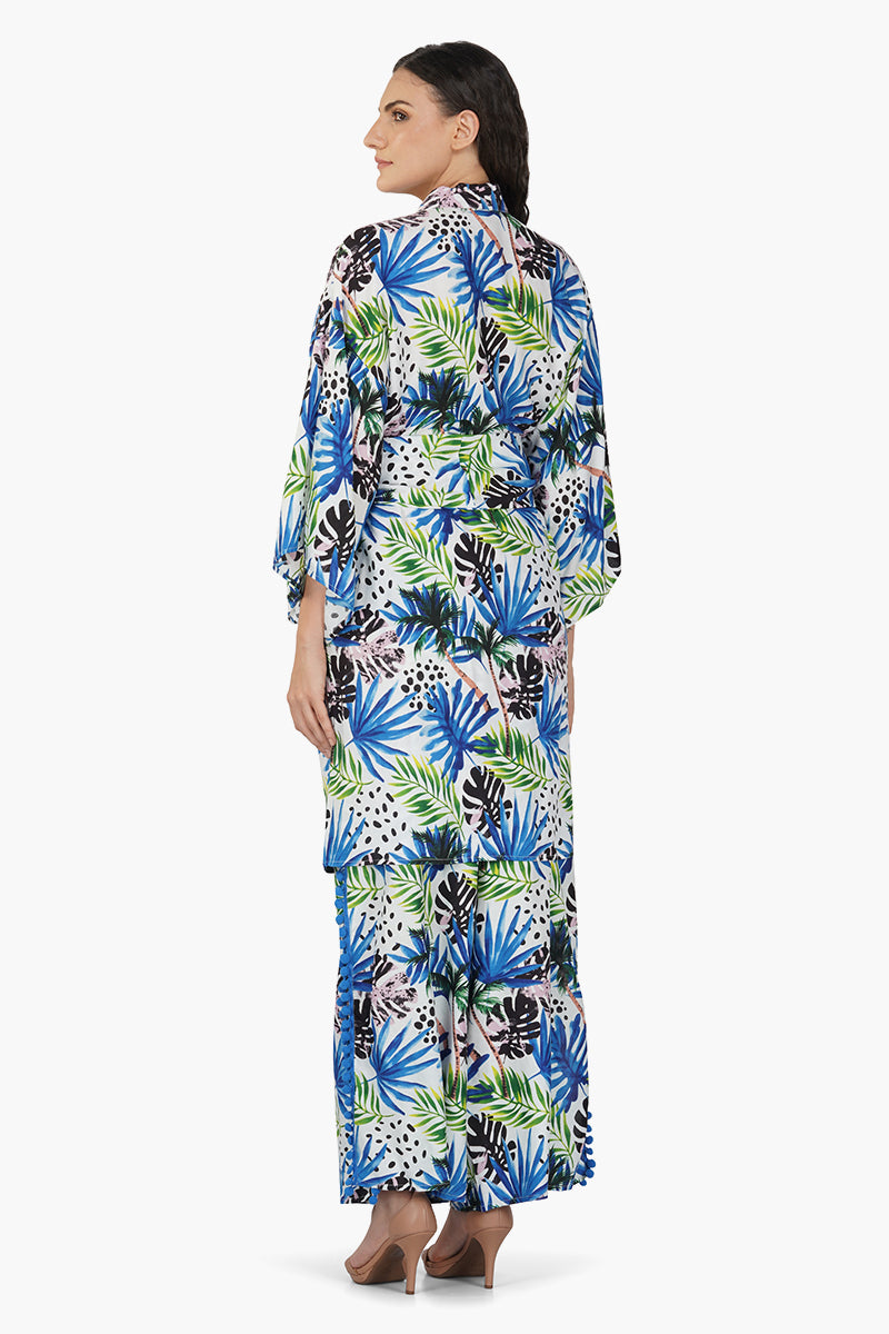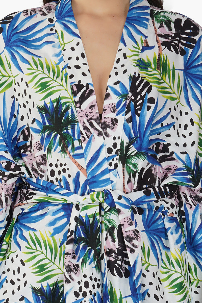 Introducing our Eva Forest Printed Cover Up, a delightful fusion of natural charm and tropical elegance. This cover-up is designed to bring the enchantment of the forest to your wardrobe, featuring a captivating tropical print that evokes the beauty of lush foliage. Crafted in soft and breathable viscose fabric, it offers comfort and style in one package, making it ideal for various occasions. The full sleeves provide a touch of coverage, while the detachable matching tie waist belt allows you to customize the fit and accentuate your waist beautifully