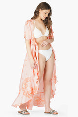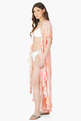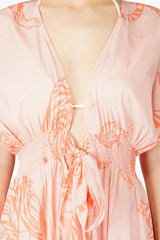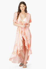 Featuring a smocked waist with a tie up detail, a hi low ruffle hemline and comfort fit sleeves, this is the most fun, flirty and happy cover up for all your quick getaways.