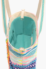 The beautiful handwoven jacquard fabric is adorned with colorful embroidery and beadwork and finished with mini pompoms for an extra touch of fun. The double straps are made for a comfortable fit, and the bag also comes with a detachable long strap for added versatility.