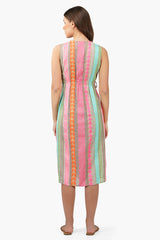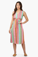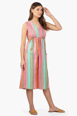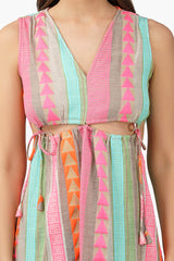 Featuring a timeless striped pattern in a beautiful blend of colors, this midi dress is sure to turn heads. The form-fitting design provides a look of sleek sophistication, while the yarn-dyed fabric ensures a long-lasting, vibrant color. With a comfortable, fit and flow silhouettelet cutouts on the waist and the detailing with the tassle tie ups, this dress is sure to flatter any figure. Whether you're attending a formal event or just looking for a stylish way to upgrade your wardrobe, this midi dress is the perfect choice!