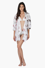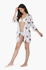 Featuring a vibrant printed design, this lightweight cover up is perfect for any summer occasion. With front tie flaps for adjustable coverage and quarter sleeves with elastic ends, you'll feel comfortable and stylish all day long.